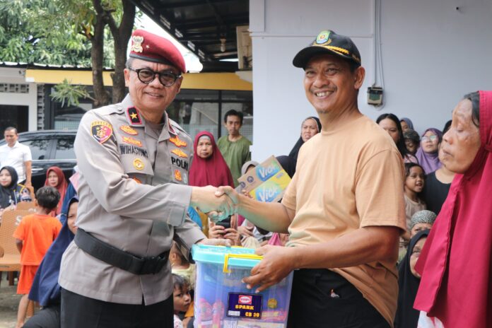 Karobinopsnal Bareskrim Polri, Brigjen Pol Raden Yoseph Wihastono Yoga Pranoto didampingi Kapolres Metro Tangerang Kota Kombes Pol Zain Dwi Nugroho dan jajaran Bareskrim Mabes Polri maupun Bhayangkari, melaksanakan bhakti sosial (baksos) Bareskrim Polri Peduli Banjir di lokasi Pengungsian RPH TUM, Kampung Candulan, Kelurahan Petir, Kecamatan Cipondoh. Kamis, (6/3/2025) pagi WIB.