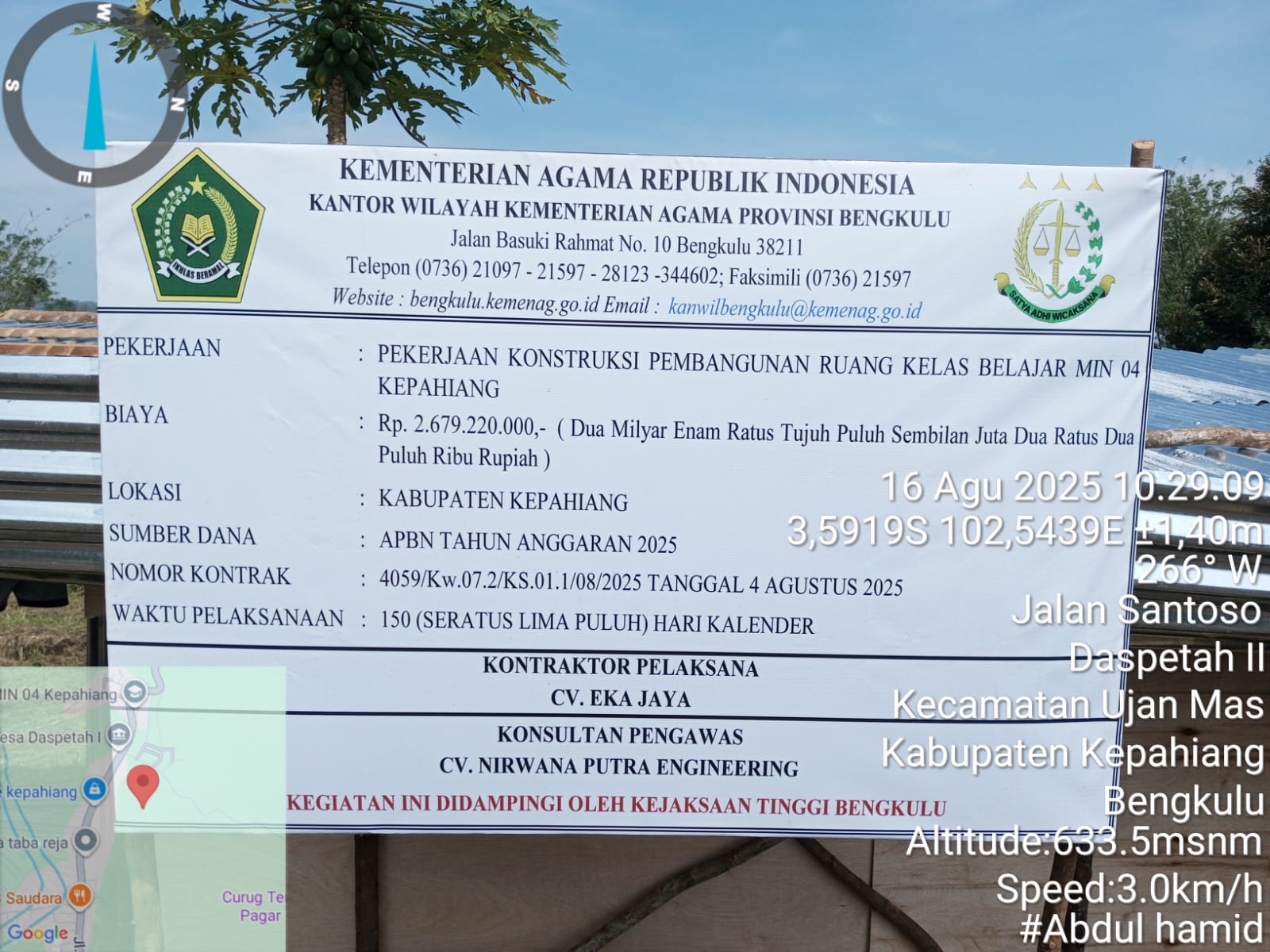 Infoberitanasional.com-Bengkulu .Kepahiang 27 Agustus 2025 Dalam mendukung program pemerintah untuk efisiensi pekerjaan kementerian agama. mengeluncurkan dana peningkatan belajar mengajar .Min 04 Kepahiang desa daspeta mendapatkan dana untuk ruang kelas belajar RKB sebesar 2.679.220.000 yang di kerjakan oleh kontraktor pelaksana CV Eka jaya dan sebagai pengawas konsultan  CV nirwana putra engineering sebagai penanggung jawab pembuat komitmen (PPk ) Henri muftiadi S.AP..