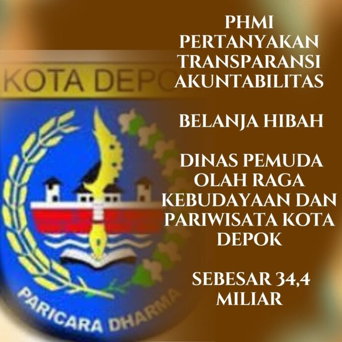 Infoberitanasional.com-PHMI | Depok – Perisai Hukum Masyarakat Indonesia (PHMI) mempertanyakan Anggaran Belanja Hibah Kepada Badan, Lembaga, Ormas Berbadan Hukum Sebesar Rp.34.430.592.300 pada Dinas Pemuda, Olah Raga, Kebudayaan Dan Pariwisata Kota Depok.