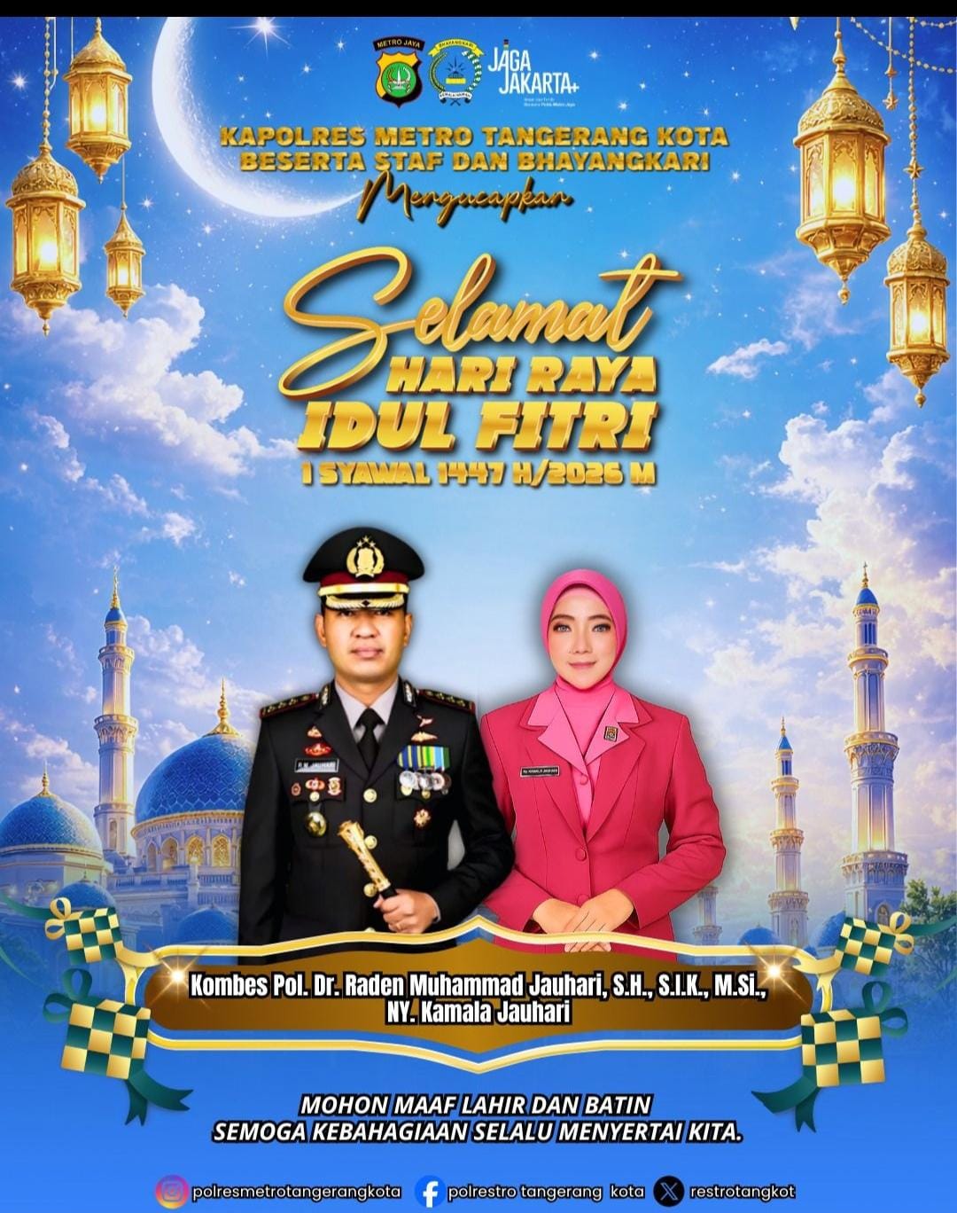 Kapolres Metro Tangerang Kota Kombes Pol.Dr.Raden Muhammad Jauhari S.H.,S.IK.,M.Si.,dengan penuh kerendahan hati mengucapkan selamat hari Raya Idul Fitri mohon maaf lahir dan bathin dan berpesan kepada jajaran untuk mengajak masyarakat untuk kembali ke fitrah dengan hati yang bersih, mempererat silaturahmi, serta menumbuhkan semangat kebersamaan dan kepedulian.